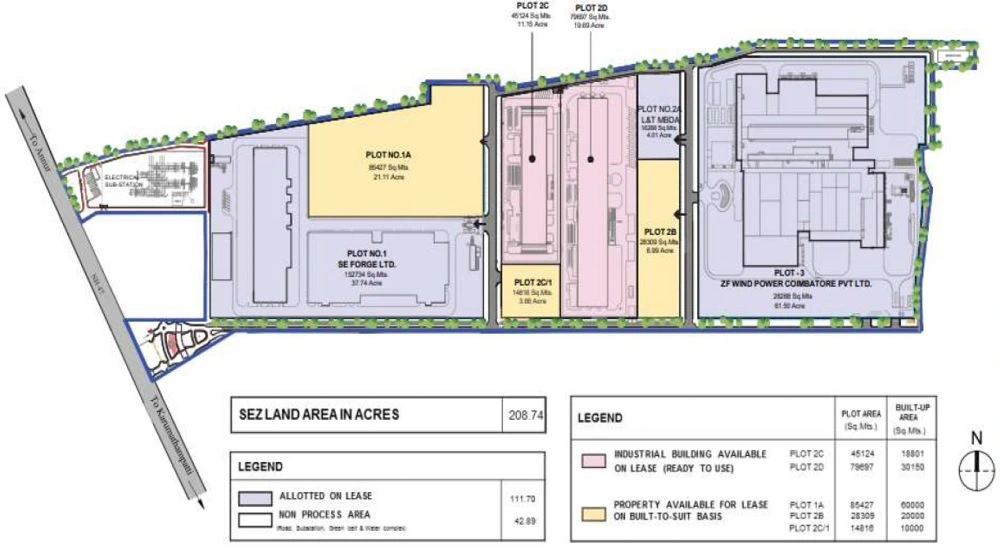 Our Industrial Park in Coimbatore is spread over 406 Acres (SEZ 208.74 acres + Industrial land 204 Acres)